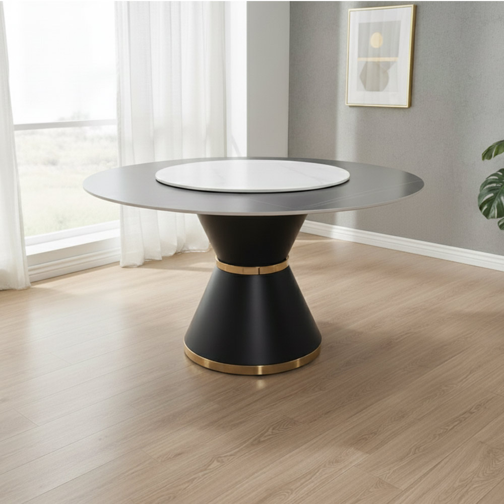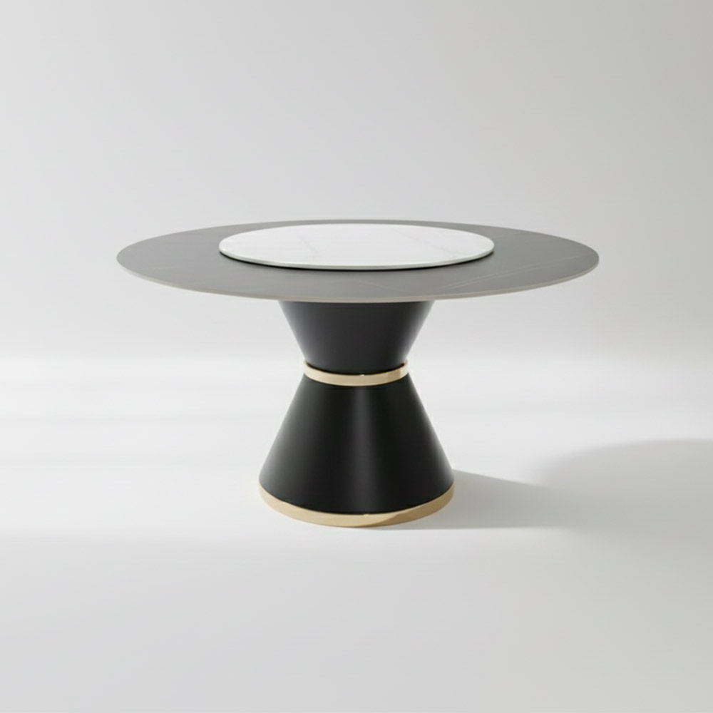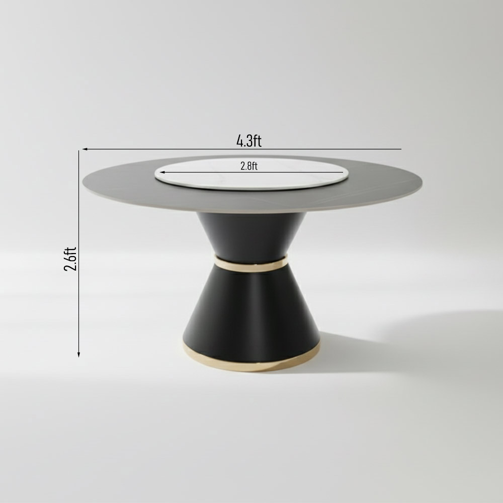 • Striking Design: Features a sleek, round tabletop in a dark finish, resting on a bold, black pedestal base accented with luxurious gold detailing.